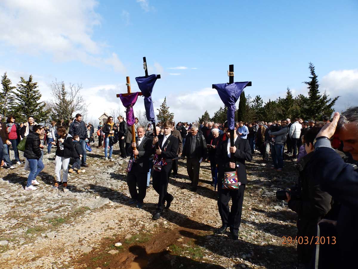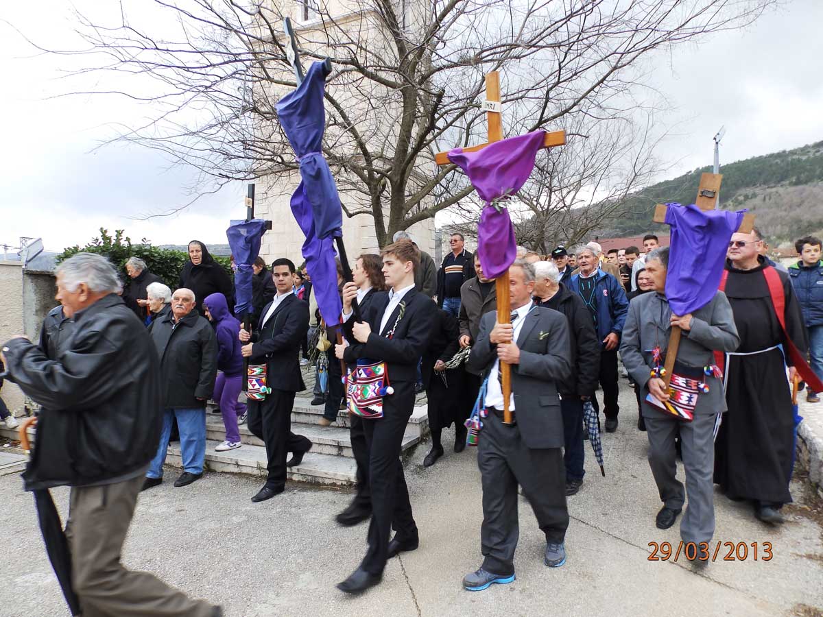 Veliki križ od crkve gospe od Karmela nosio je Ivan Puljić, mali križ Andrija Babić a dječji Tomislav Bugarić. Križ iz crkve svetog Ivana nosio je Ivan Škoro pok. Mate, dok su križeve iz crkva svetog Nikole nosili Ivan Puljiz i Nediljko Jerković.